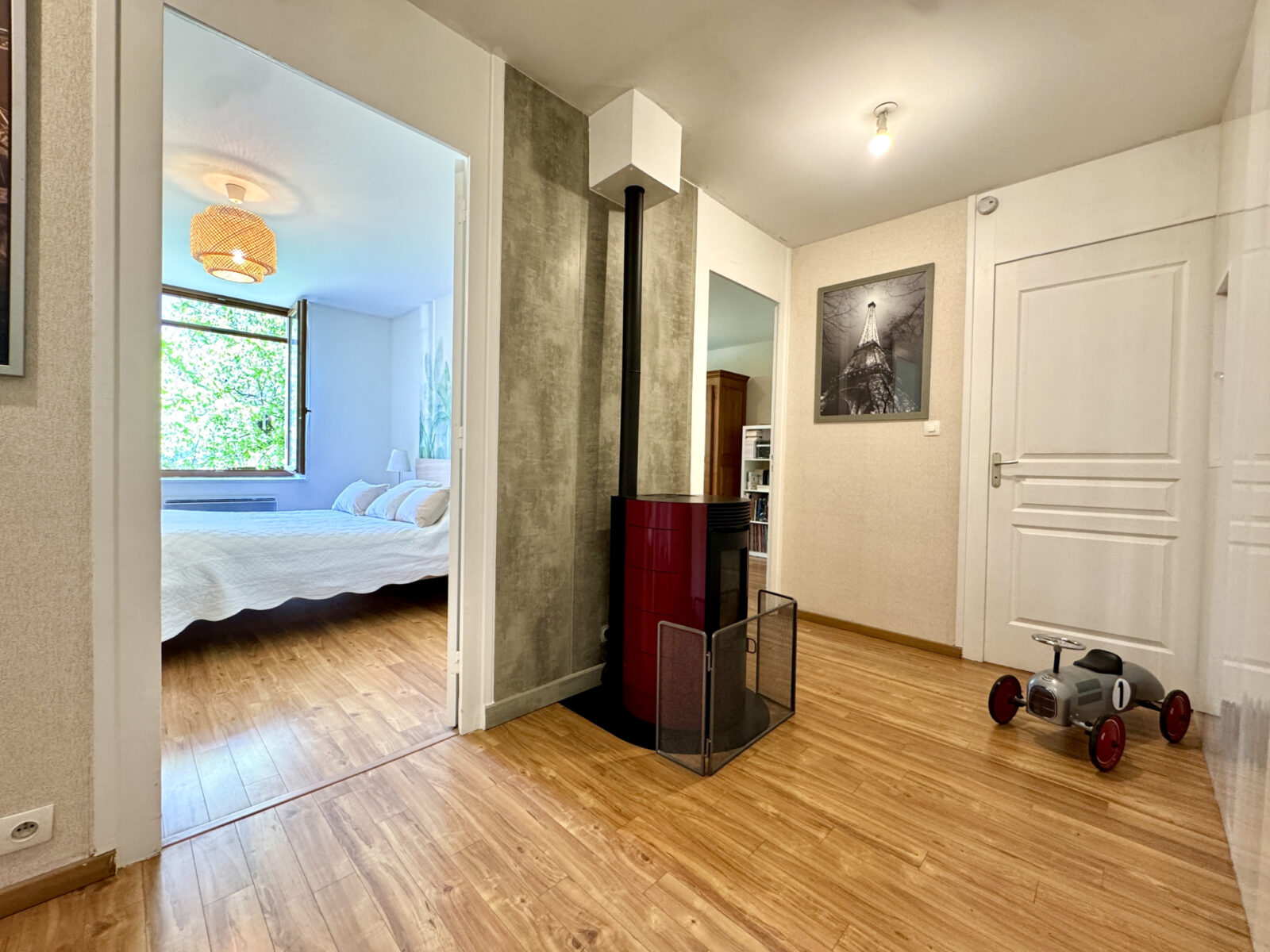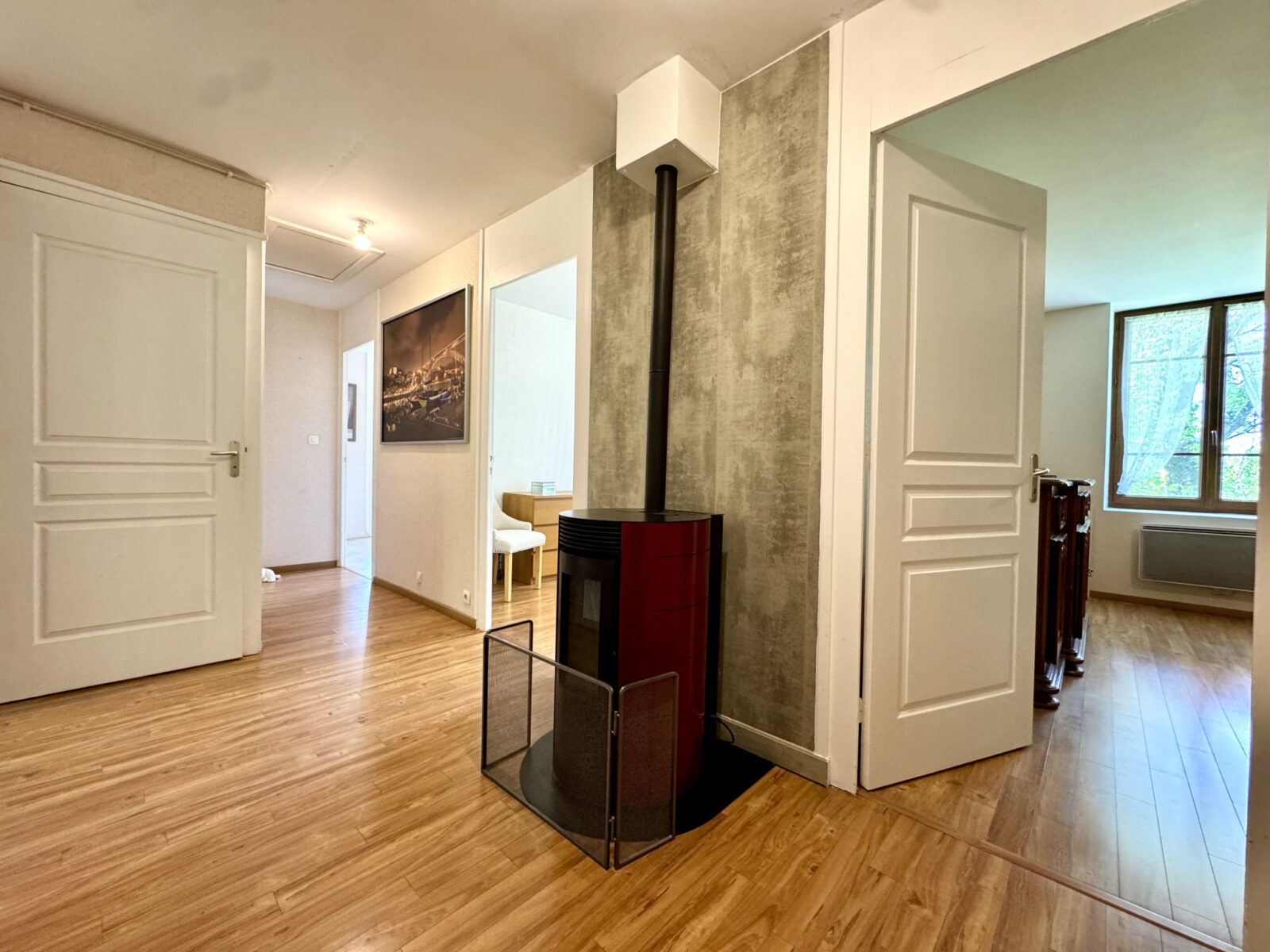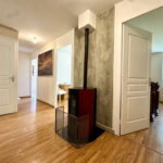 L’appartement bénéficie de prestations de qualité : double vitrage, chauffage individuel avec poêle à granulés, ballon d’eau chaude de 200 L…